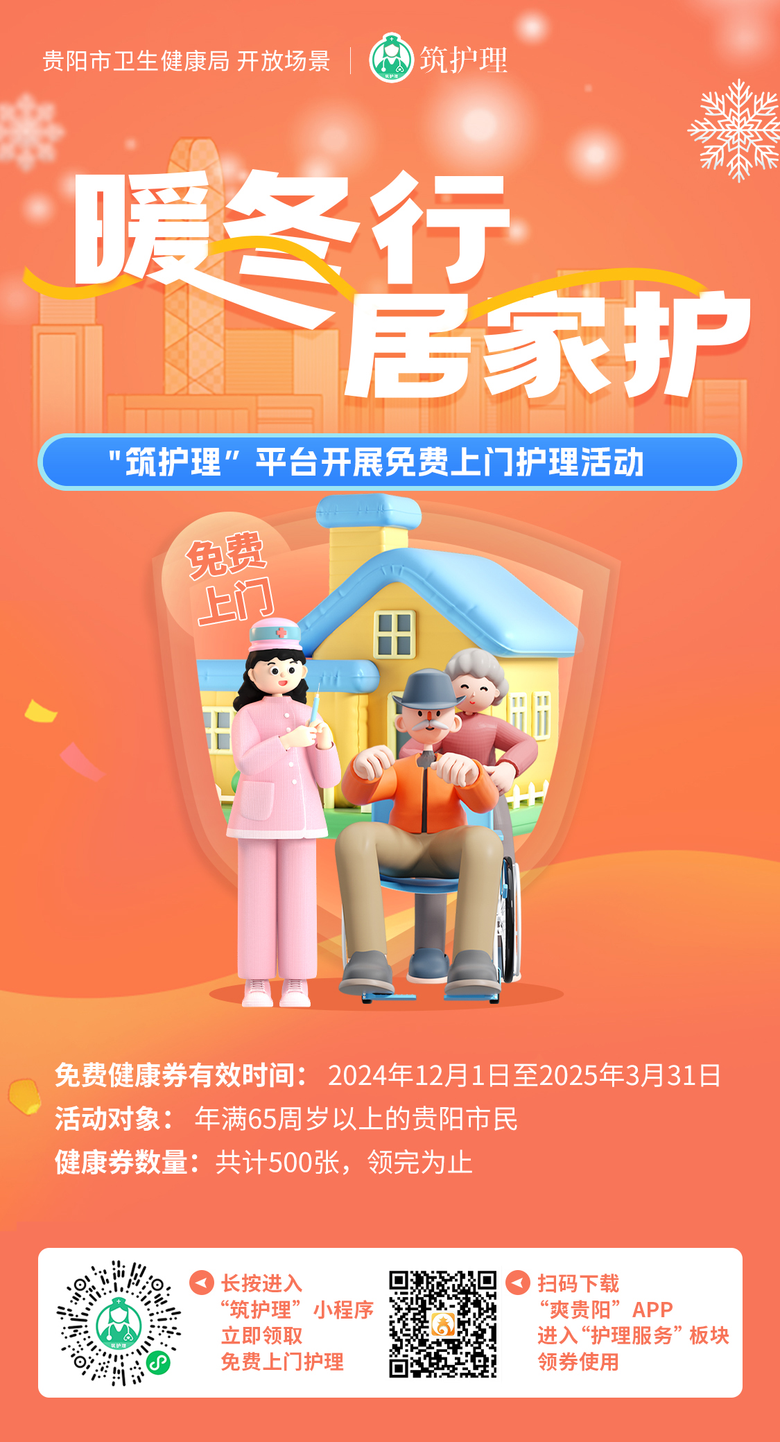 为应对贵阳市较为寒冷的冬季天气,关怀65岁以上群体护理需要,“筑护理"平台开展免费上门护理活动。本次活动共计发放500张健康券,领券用户即可享受免费上门护理服务,让老年人在寒冷的冬季能够享受到贴心的健康关怀、温暖过冬。