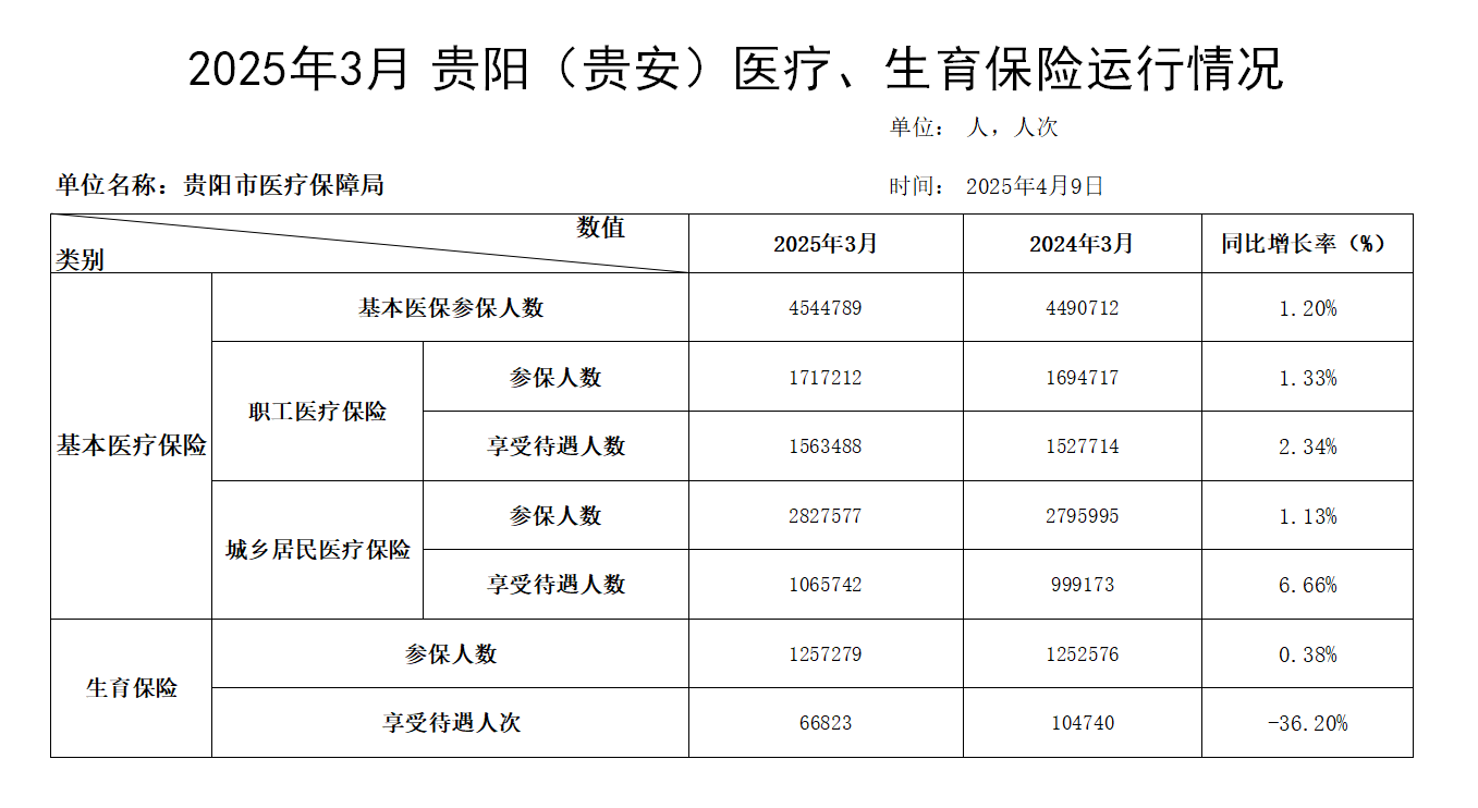 截至2025年3月底,2025年贵阳贵安医疗、生育保险参保人数,享受待遇人数统计情况如下: