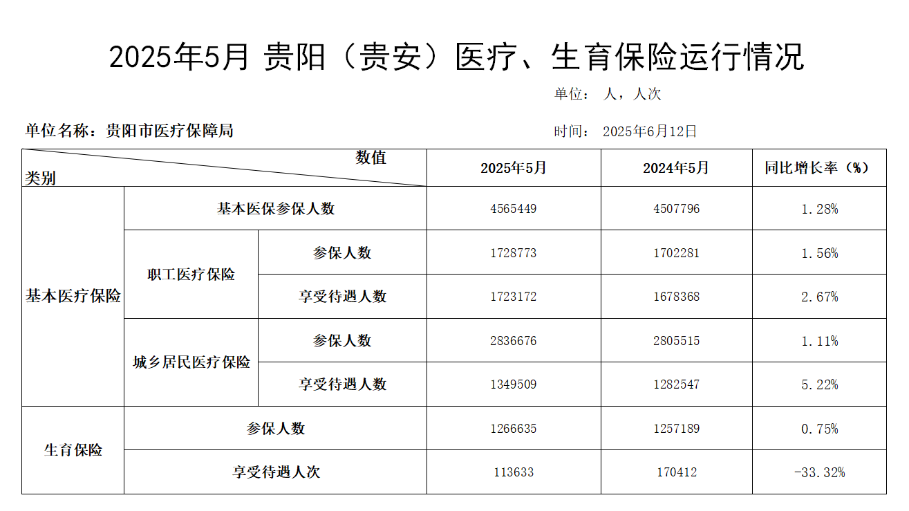 截至2025年5月底,2025年贵阳贵安医疗、生育保险参保人数,享受待遇人数统计情况如下:
