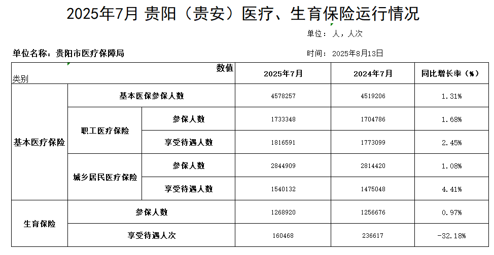 截至2025年7月底,2025年贵阳贵安医疗、生育保险参保人数,享受待遇人数统计情况如下: