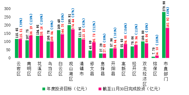 ——分责任单位看,白云区、观山湖区、双龙航空港经济区和市直部门未达到时序进度,云岩区、乌当区、清镇市和息烽县按时序进度推进中,南明区、花溪区、修文县、开阳县、高新区、经开区和综保区已提前完成年度投资目标。进度排前三位的是:修文县、综保区、高新区,分别完成年度投资目标的212.31%、183.51%、154.19%,投资排前三位的是:观山湖区、白云区、南明区,分别完成投资174.44亿元、144.25亿元、136.19亿元(见图2)。