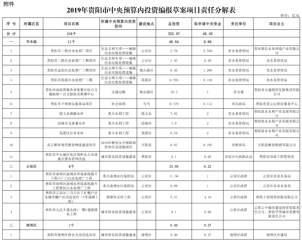 附件:2019年贵阳市中央预算内投资编报草案项目责任分解表
