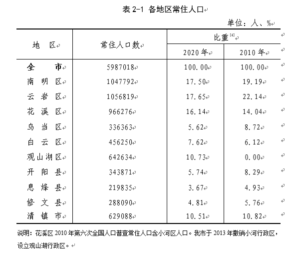 分区域看[3],六城区人口为450.61万人,占75.27%;三县一市人口为148.09万人,占24.73%。其中,观山湖区人口64.26万人,占全市人口10.73%。
