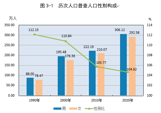 全市常住人口[2]中,男性人口为3061169人,占51.13%;女性人口为2925849人,占48.87%。总人口性别比(以女性为100,男性对女性的比例)为104.62,与2010年第六次全国人口普查的105.77比下降1.15个百分点。