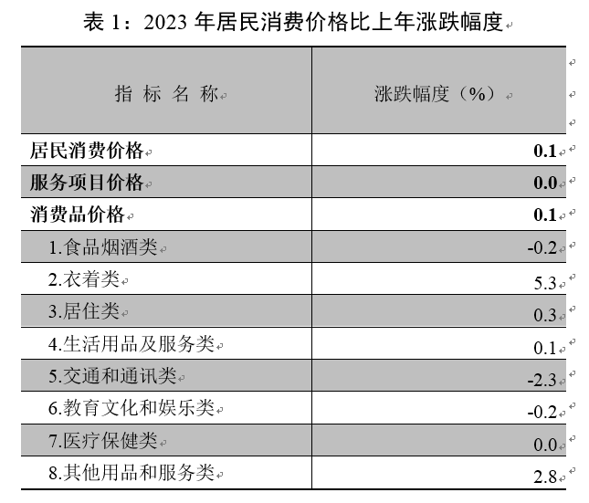 全年居民消费价格总水平上涨0.1%,涨幅比上年缩小1.8个百分点。其中,食品价格下降0.1%,非食品价格上涨0.1%;消费品价格上涨0.1%,服务价格与上年同期持平。