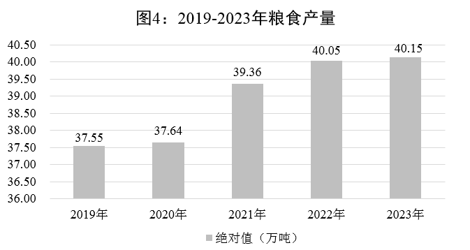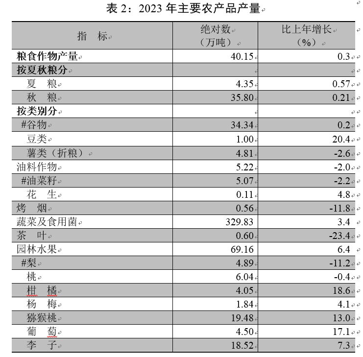 全年粮食产量40.15万吨,比上年增长0.25%。其中,谷物产量34.34万吨,增长0.2%;豆类产量1.00万吨,增长20.4%;薯类产量(折粮)4.81万吨,下降2.6%。