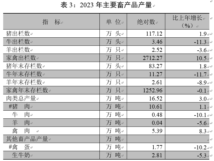 全年猪、牛、羊、禽肉“四肉”产量16.52万吨,比上年增长3.0%;禽蛋产量1.77万吨,下降10.2%;生牛奶产量2.81万吨,下降5.3%;水产品产量0.40万吨,增长7.0%。