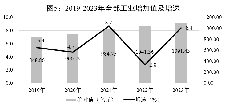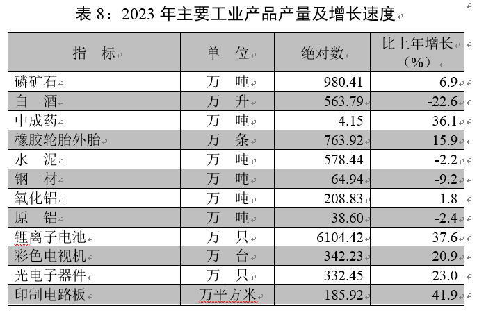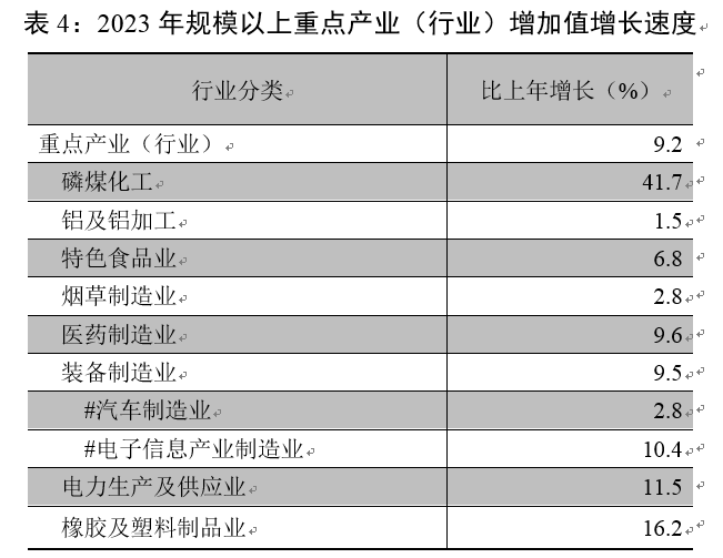 全年全部工业增加值1091.43亿元,比上年增长8.4%。规模以上工业(4)增加值增长9.6%,其中,规模以上工业八大重点产业(行业)增加值增长9.2%,占规模以上工业增加值的88.4%,分别是,磷煤化工业增长41.7%、铝及铝加工业1.5%、特色食品业6.8%、烟草制造业增长2.8%、医药制造业9.6%、装备制造业增加值增长9.5%、电力生产及供应业增加值增长11.5%、橡胶及塑料制品业16.2%。规模以上工业园区企业增加值增长10.2%,占规模以上工业增加值的78.9%。轻工业增加值增长4.2%,重工业增加值增长15.4%;分经济类型看,国有企业增加值增长11.0%;国有控股企业增加值增长9.6%;民营企业增加值增长9.7%;外商及港澳台投资企业增加值增长9.4%;大中型企业增加值增长9.0%;小微型企业增加值增长11.9%。