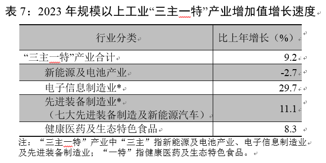 全市“三主一特”重点产业增加值比上年增长9.2%,占全市规模以上工业增加值比重达28.1%。其中,电子信息制造业增长29.7%,占规模以上工业增加值的3.2%,拉动规模以上工业增加值增长0.8个百分点;先进装备制造业增长11.1%,占规模以上工业增加值的7.6%,拉动规模以上工业增加值增长0.9个百分点;健康医药及生态特色食品增长8.3%,占规模以上工业增加值的13.1%,拉动规模以上工业增加值增长1.1个百分点。
