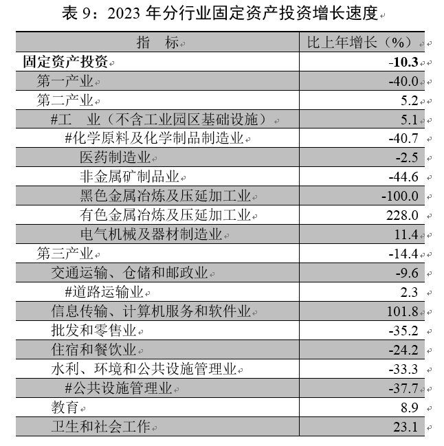 全年固定资产投资(5)比上年下降10.3%。分产业看,第一产业投资下降40.0%;第二产业投资增长5.2%;第三产业投资下降14.4%。