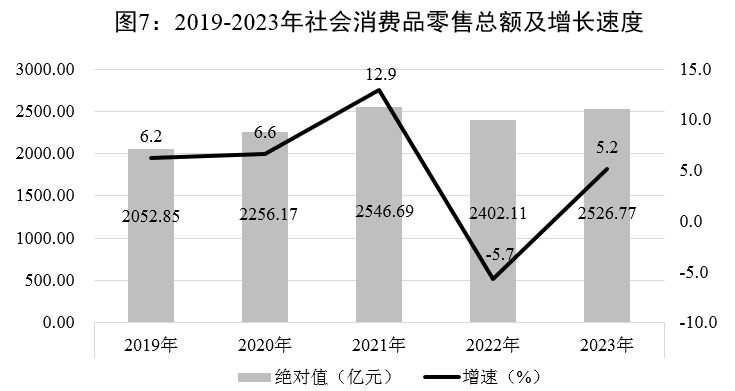 全年社会消费品零售总额2526.77亿元,比上年增长5.2%。其中,限额以上消费品零售额1111.11亿元,增长5.3%。按经营地统计,限额以上城镇消费品零售额1080.71亿元,增长3.8%,其中城区消费品零售额994.54亿元,增长6.0%;乡村消费品零售额30.41亿元,增长117.6%。按消费类型分,限额以上商品零售额1064.84亿元,增长4.8%;餐饮收入46.27亿元,增长18.6%。