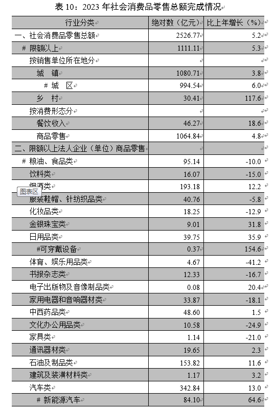 限额以上单位商品零售额中,粮油、食品类零售额比上年下降10.0%,饮料类下降15.0%,烟酒类增长12.2%,服装、鞋帽、针纺织品类下降5.8%,化妆品类下降12.9%,可穿戴智能设备类增长154.6%,金银珠宝类增长31.8%,书报杂志类下降16.7%,电子出版物及音像制品类增长20.4%,中西药品类增长1.5%,文化办公用品类下降24.9%,家具类下降21.0%,通讯器材类增长2.3%,建筑及装潢材料类增长3.2%,新能源汽车类增长64.6%。