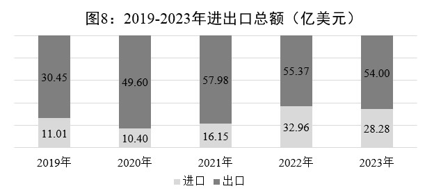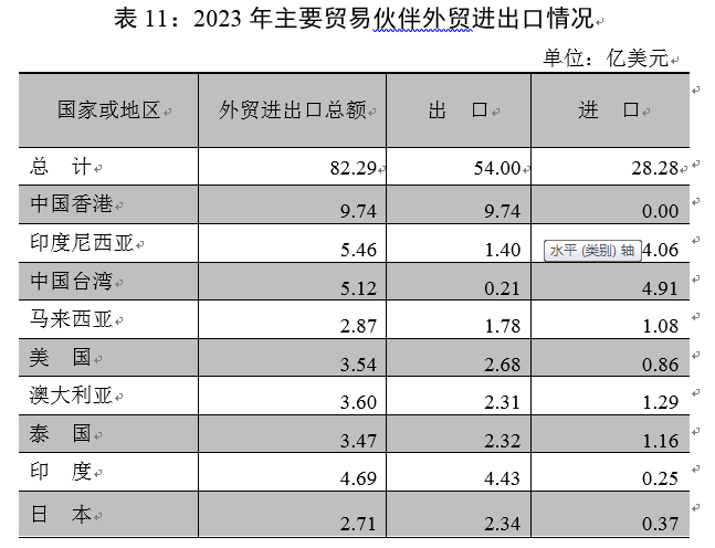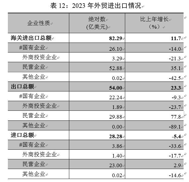 全年外贸进出口总额82.29亿美元,比上年增长(6)11.7%。其中出口54.00亿美元,增长23.3%;进口28.28亿美元,下降5.4%。