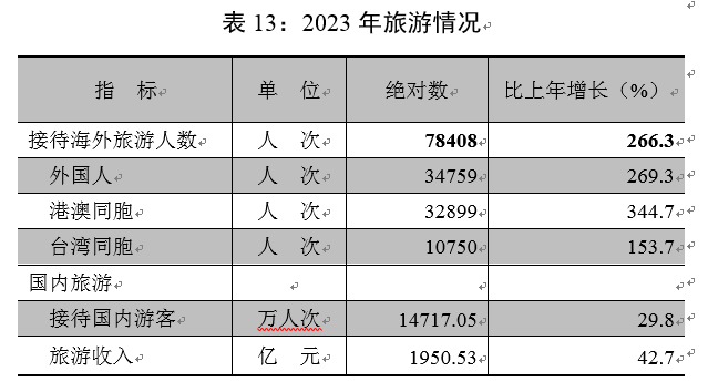 全年旅游总人数14724.89万人次,比上年增长29.8%,其中接待国内游客14717.05万人次,接待外国(海外)游客7.84万人次。旅游总收入1952.51亿元,增长42.8%,其中旅游外汇收入达2758万美元,增长274.4%。