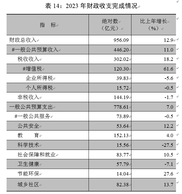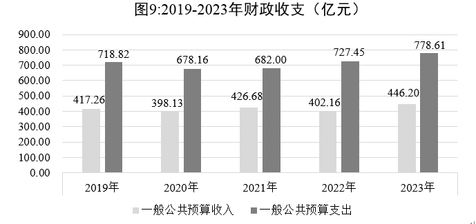 全年财政总收入956.09亿元,比上年增长12.9%;一般公共预算收入446.20亿元,增长11.0%;一般公共预算支出778.61亿元,增长7.0%。