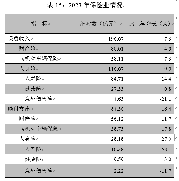 全年保险保费收入196.67亿元,比上年增长7.3%。保险赔付支出84.30亿元,增长16.4%。