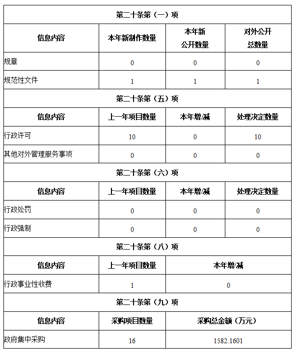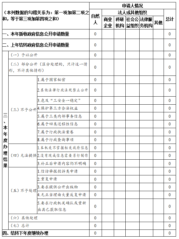 在已经答复的0件申请中,“同意公开”的0件,占总数的0%,主要涉及政策咨询、数据公开、用于论文撰写的相关资料查询等。“同意部分公开”0件,占总数的0%,“不予公开”0件,占总数的0%,主要是因为涉及商业秘密或个人隐私。“不属于政府信息公开的范围”0件,占总数的0%。主要是因为申请的内容不属于政府信息公开范围。“非本机关政府信息”0件,占总数的0%,主要是因为申请的内容不是本机关政府信息;“申请内容不明确”0件,占总数的0%,主要是因为所申请的信息内容描述不明确。