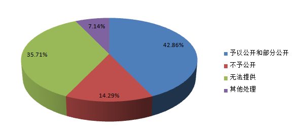 从办理结果看,予以公开和部分公开6件,占42.86%;不予公开2件,占14.29%;因本机关不掌握等原因无法提供5件,占35.71%;其他处理1件,占7.14%。