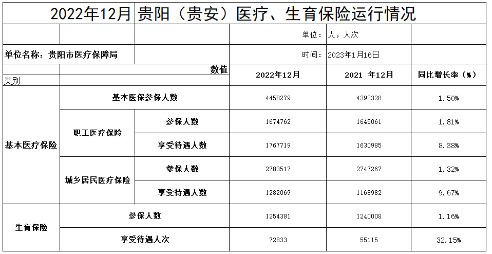 截至2022年12月底,贵阳贵安医疗、生育保险参保人数,享受待遇人数统计情况如下: