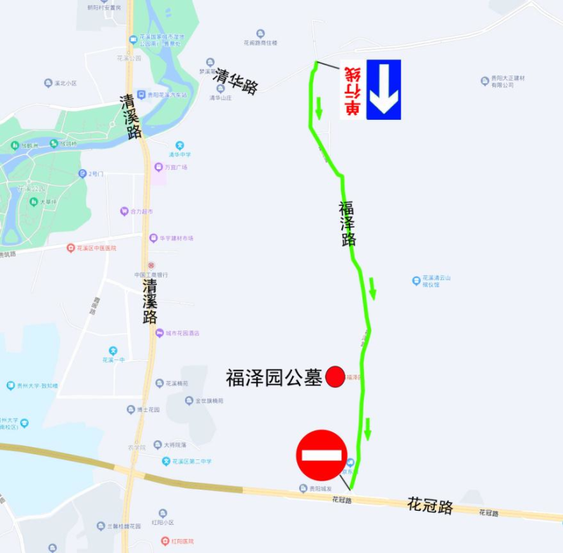 二、福泽路实施由北向南单向通行,需驶入的车辆请从清华路驶入,由花冠路驶出。