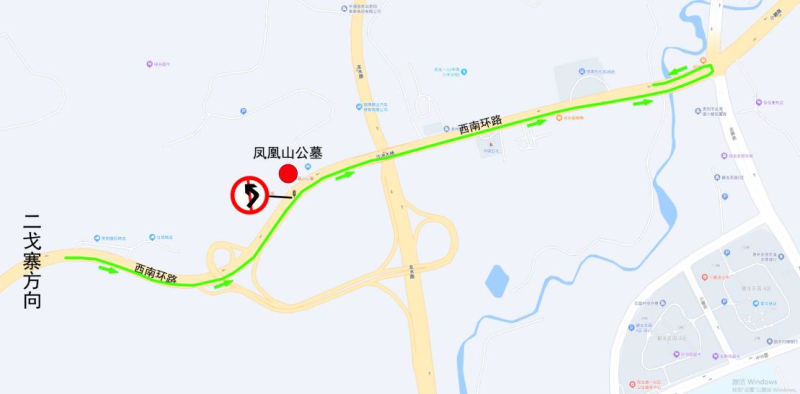 三、西南环路凤凰山公墓路口禁止二戈寨方向驶来的车辆左转,需左转及掉头的车辆于西南环路与龙腾路交叉口掉头。