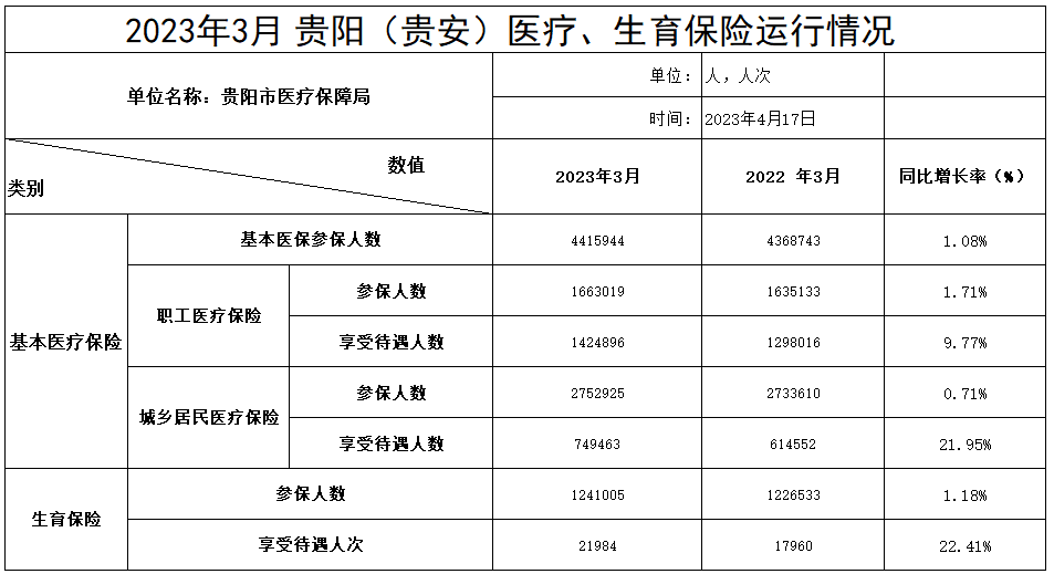截至2023年3月底,2023年贵阳贵安医疗、生育保险参保人数,享受待遇人数统计情况如下: