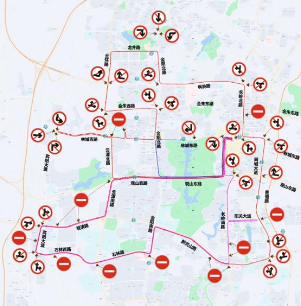 2、从2024年6月16日5:30时起至赛事结束,会展北路、会展南路、观山东路(长岭南路至八匹马双向)、观山西路(八匹马至云潭南路双向)、云潭南路(观山西路至观清路段)、观清路(云潭南路至宾阳大道段)、宾阳大道(观清路至石林西路段)、石林西路(宾阳大道至云潭南路段)、石林东路(云潭南路至金阳南路段)、金阳南路(石林东路至黔灵山路段)、黔灵山路(金阳南路至同城大道段)、同城大道(黔灵山路至林城东路段)、阳关大道(长岭南路至同城大道双向)、长岭南路(黔灵山路至观山东路段)、林城东路(金阳北路至石标路双向、同城大道至长岭北路段)、长岭北路(林城东路至枫林路段)、枫林路(长岭北路至金阳北路段)、金阳北路(枫林路至龙井路段、金朱西路至林城西路段、观山东路至林城东路段)、龙井路(金阳北路至云环路段)、云环路(龙井路至金湖路段)、云潭北路(金湖路至金朱西路段、林城西路至观山西路段)、金朱西路(云潭北路至金阳北路段)、林城西路(云潭北路至宾阳大道双向、金阳北路至云潭北路段、金阳北路至石标路段)、龙滩坝路(林城西路至龙海路双向)将实施临时交通管制,禁止一切车辆通行。