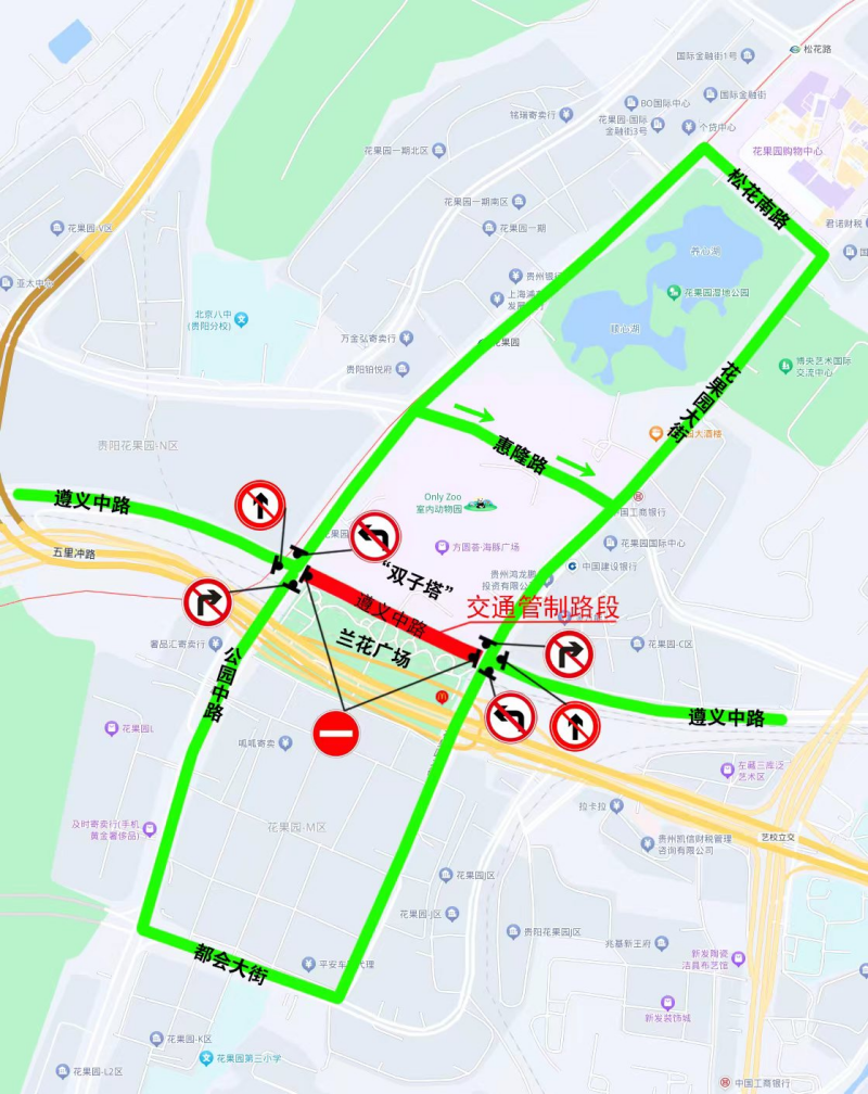 一、2024年6月28日上午8:00-11:00,对遵义中路部分路段(花果园大街口至公园中路口)双向实施临时交通管制,交通管制期间禁止车辆通行。