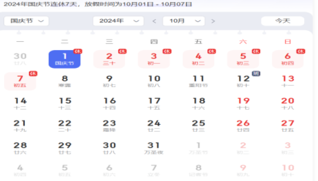 根据《国务院办公厅关于2024年部分节假日安排的通知》,2024年国庆节的放假调休安排如下:10月1日至7日放假调休,共7天。9月29日(周日)、10月12日(周六)上班。