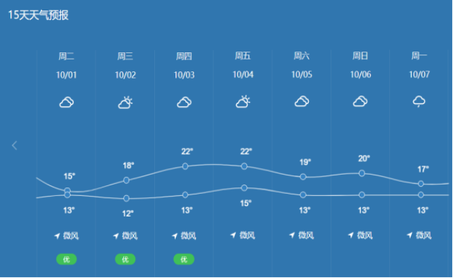 根据天气预报,国庆节假期七天,我市整体天气较为凉爽舒适,以多云和阴天为主,气温适中,10月7日有小雨,出行前请关注天气变化和路况信息,合理规划出行时间和线路,确保行车安全。