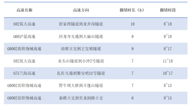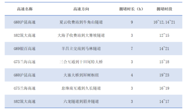 返程高峰时段,预计G60沪昆高速、G75兰海高速、G69银百高速、S82筑大高速等高速的部分路段。建议行驶到以下路段的车主时刻注意路况,及时躲避拥堵。