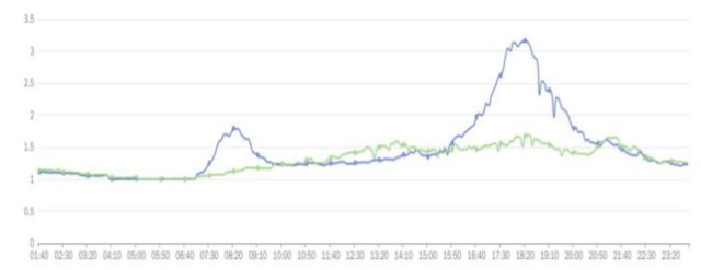 9月30日(蓝线)与日常(绿线)交通拥堵指数走势对比预测图