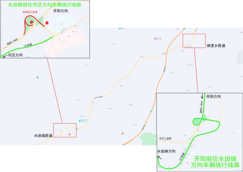 三、交通组织调整情况:由开阳经云开二级公路前往水田镇的车辆提前由新堡匝道经X157绕行;由水田镇前往市区方向的车辆由X157绕行。