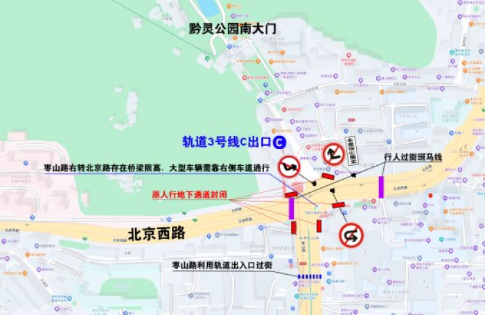 (三)北京路与枣山路交叉口地下人行通道暂停使用。