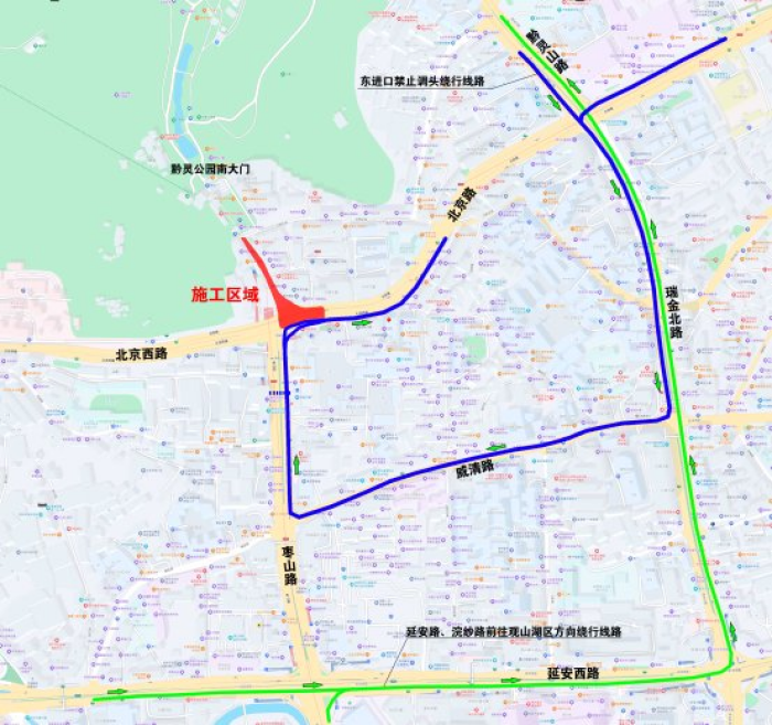 (二)在北京路与枣山路交叉口东进口有调头需求的车辆提前由瑞金北路-威清路-枣山路绕行。