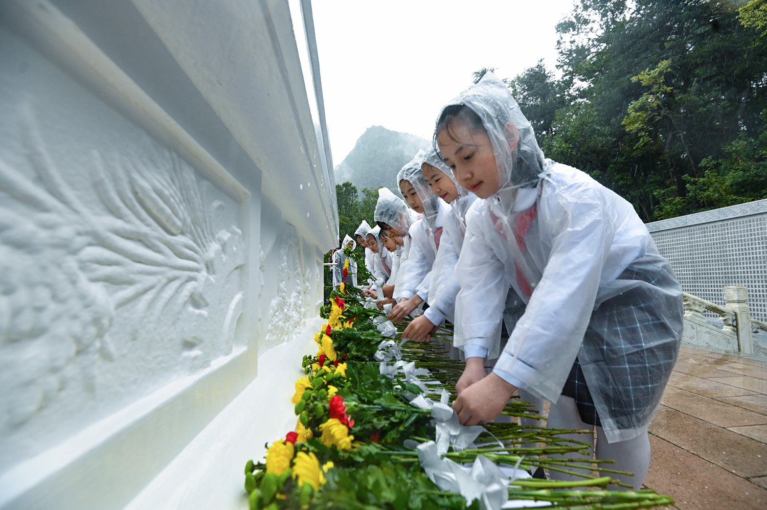 少先队员瞻仰革命烈士纪念碑并献花,向英烈们表达崇高敬意。