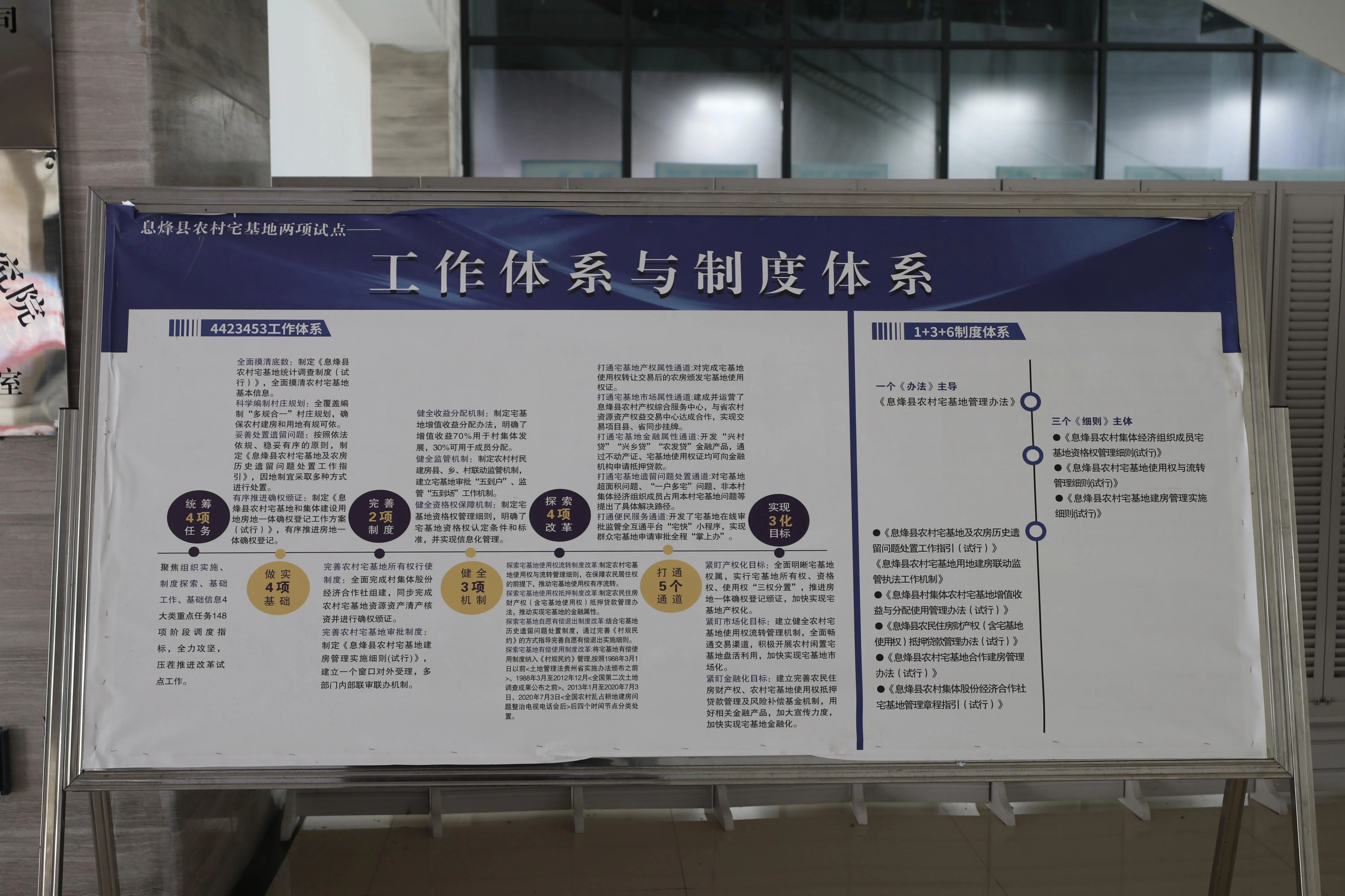 2020年9月,中央农办、农业农村部在全国104个县(市、区)以及3个地级市启动实施新一轮农村宅基地制度改革试点。受益于多年来成功完成农村产权制度改革、农村土地确权颁证等多项涉农改革打下的良好基础,息烽县入选新一轮全国农村宅基地制度改革试点地区之一。以探索创新推进农村宅基地制度改革为契机,进一步加快农业产业化,盘活农村资产,增加农民财产性收入,2020年12月,息烽县农村产权综合服务中心挂牌成立,并于2022年1月完成首单农村宅基地及农房使用权交易。2023年5月息烽县农村产权综合服务中心完成升级改造,下设“一平台五中心”,集成政策宣传、交易咨询、资产评估、融资咨询、纠纷调解仲裁、财务集中管理和核算等功能,为广大办事群众、村集体、村民提供产权流转全流程服务。当年12月,该中心交易额在全省率先突破亿元大关。