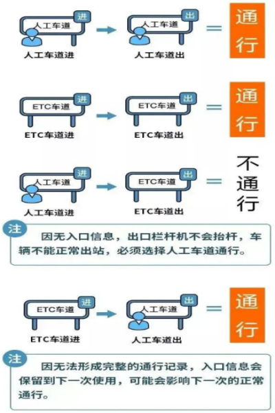 二、车辆进出高速公路切记从人工通道进入就从人工通道驶出,从ETC车道进入就从ETC车道驶出,不要走错通道,以免造成交通拥堵、增加事故的风险、增加不必要的麻烦。