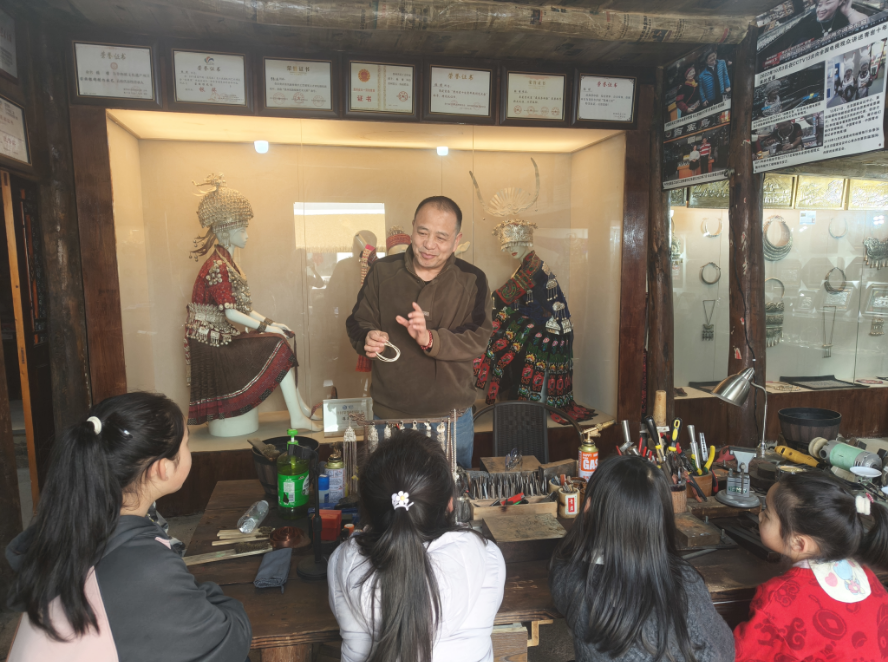 初二学生吴彦哲弓着腰,专注锻打手中银块,耗时三小时完成人生第一把银饰剑。“平时很少接触这些手艺,感觉开启了新世界的大门!”他举起作品,眼中闪着兴奋的光。