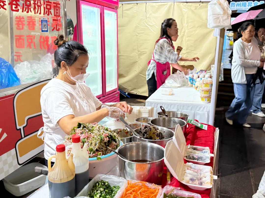 在本次美食节主会场活动现场,人潮涌动,花溪羊肉粉、安顺裹卷、黔南刺梨等各类美食挑动味蕾,引来不少游客争相品尝与购买。
