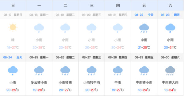 根据气象部门发布的预报,8月29日(周五)-8月30日(周六)贵阳市天气为中雨,气温在18-24℃。