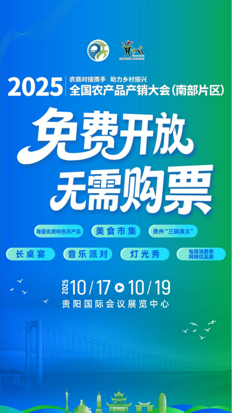 记者从贵阳市商务局获悉,10月17日至19日,2025年全国农产品产销大会(南部片区)暨南方美食市集・贵州站将在贵阳国际会议展览中心北广场举办。这场汇集七省(区、市)风味的美食盛宴不仅免门票,还将通过“一码游贵州”微信小程序及活动现场发放千余张美食免费体验券,市民游客可核销体验美味,东道主贵阳更以丰富本土特色“C位”亮相,邀大家共赴舌尖狂欢。
