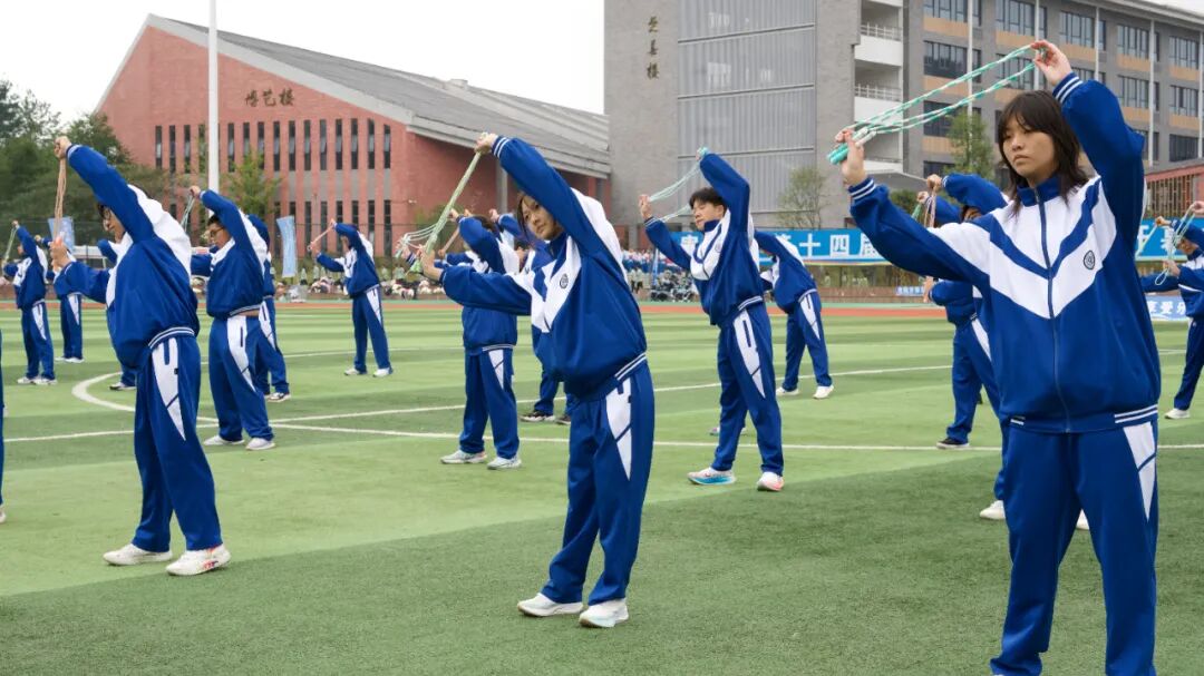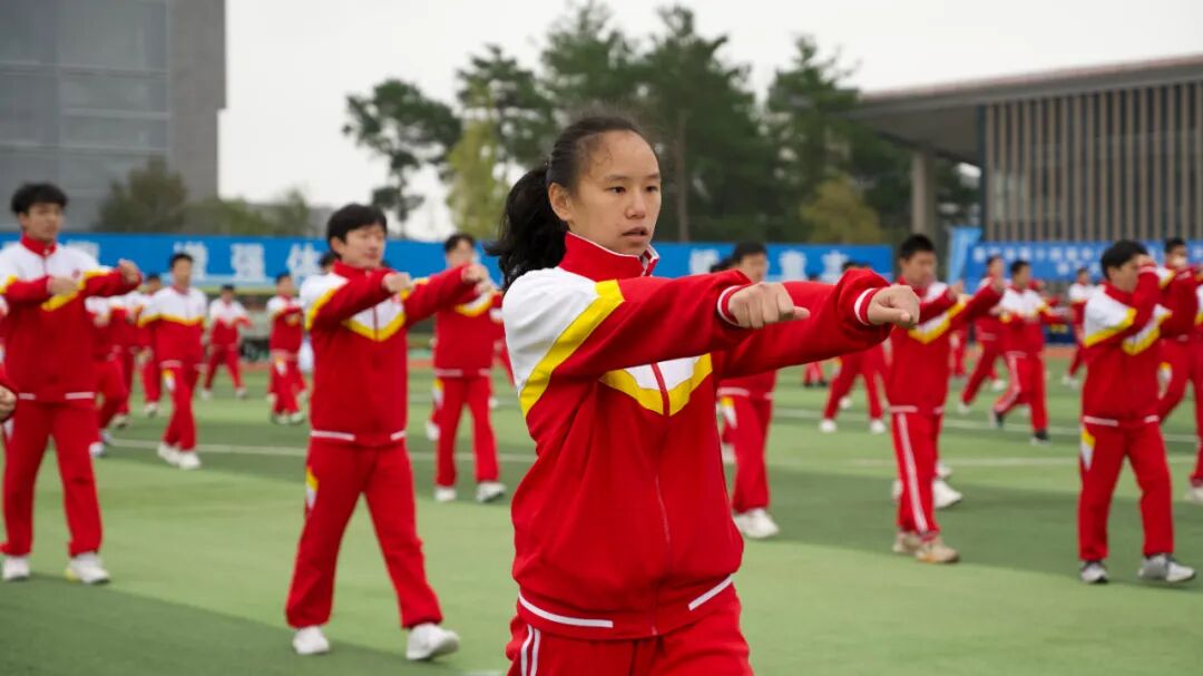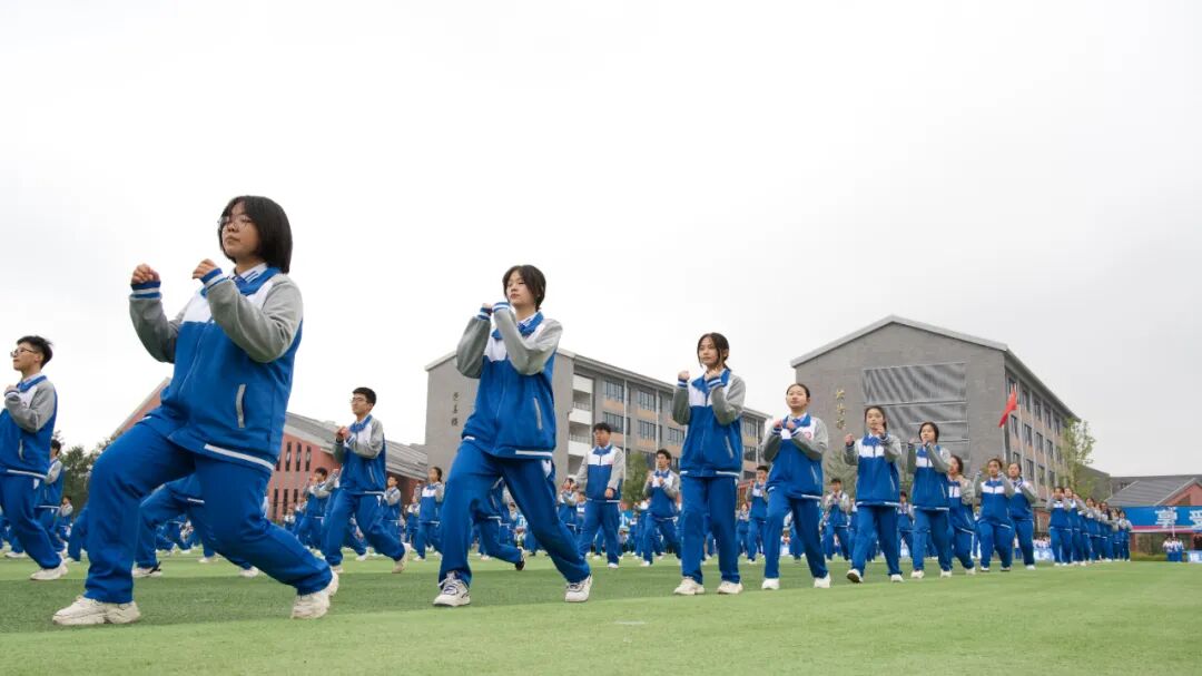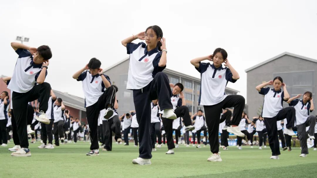 有的学校将民族舞蹈的灵动与韵律操巧妙融合,在学生们的轻盈跳跃、旋转变换间,民族风情与运动活力扑面而来;有的则把足球、篮球、跳绳等运动元素融入课间操,让日常锻炼充满趣味与挑战;还有的以传统武术为根基,百名学生队列整齐,拳脚齐出、气势如虹,用刚劲的动作践行“强国有我”的铿锵誓言,瞬间点燃全场热情,引得观众席掌声雷动。
